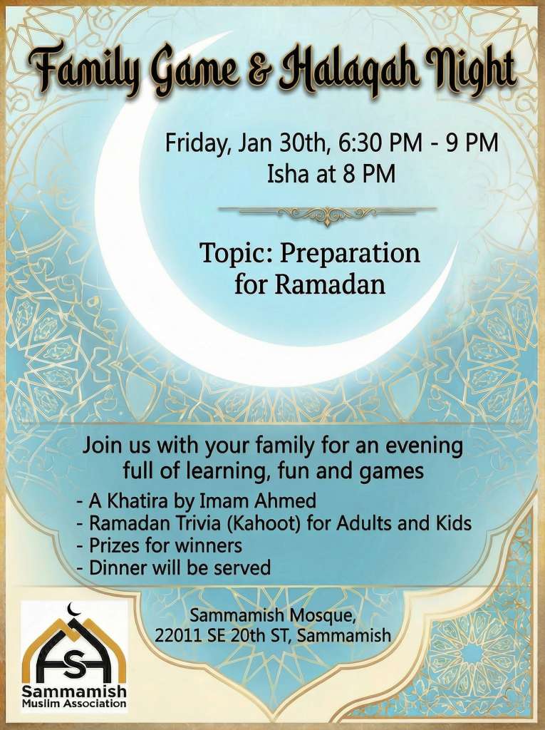Join us for an unforgettable evening. Listen to an Inspiring Khatira on “Preparation for Ramadan’ by Imam Ahmed Almanasrah. Ramadan Quiz with prizes up for grabs. Dinner will be served! Please sign up to help us serve you better.