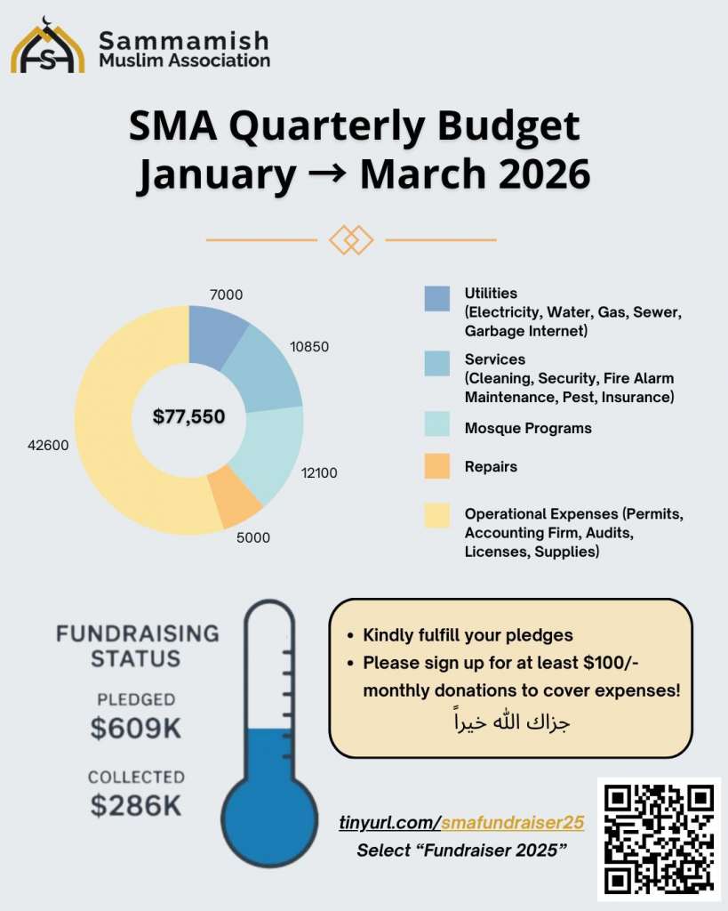 As we welcome the blessed month of Ramadan, we want to extend our heartfelt greetings to you and your families on behalf of the Sammamish Muslim Association and Board of Directors and Board of Trustees. As previously communicated, based on the announcement by the Fiqh Council of North America, we anticipate the start of Ramadan this coming Wednesday, February 18th 2026, and our first Taraweeh prayer scheduled for Tuesday, February 17th 2026.